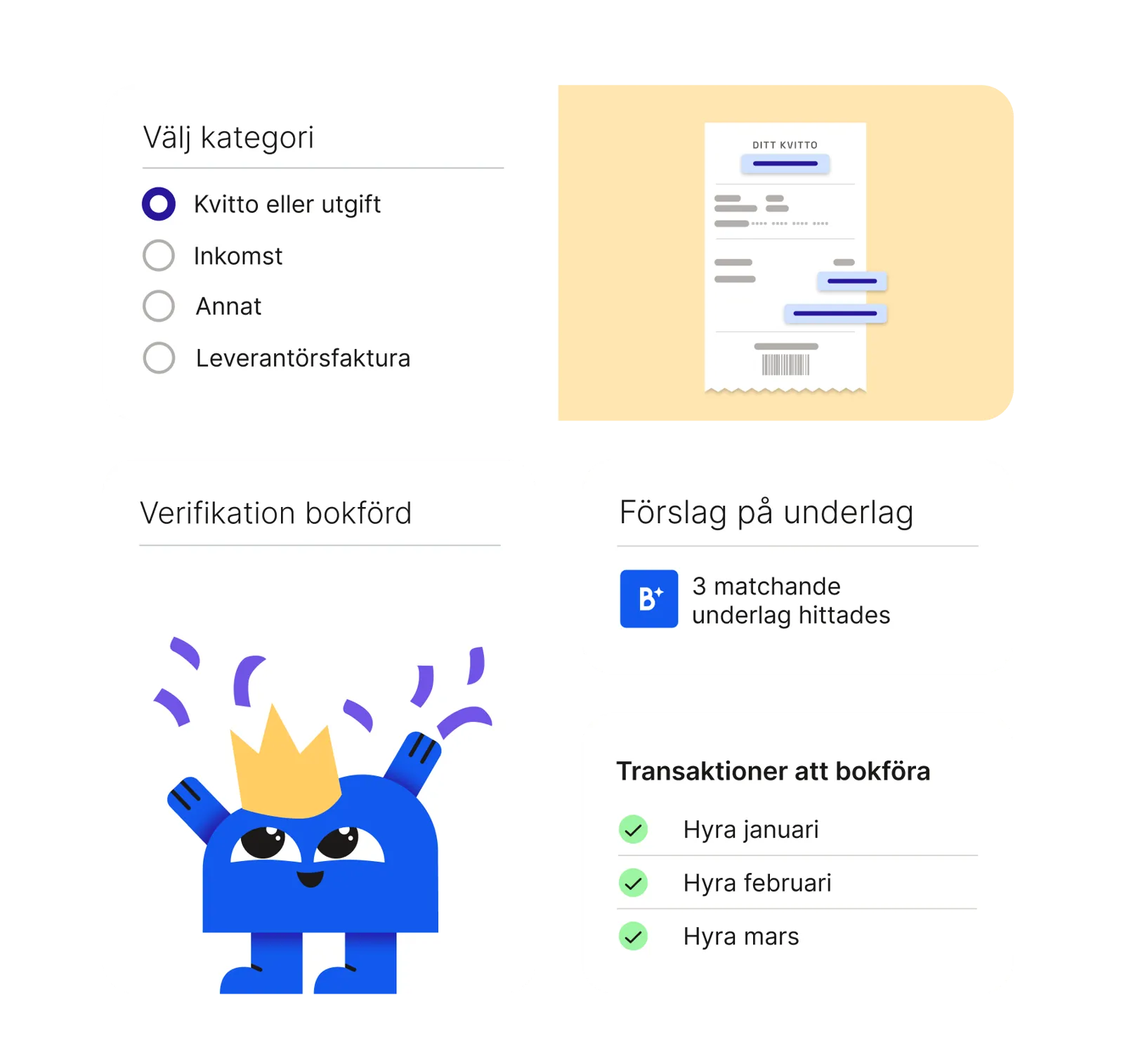 Fota det du vill bokföra direkt med mobilen eller ladda upp via datorn. Vi hjälper dig matcha underlaget till rätt transaktion.