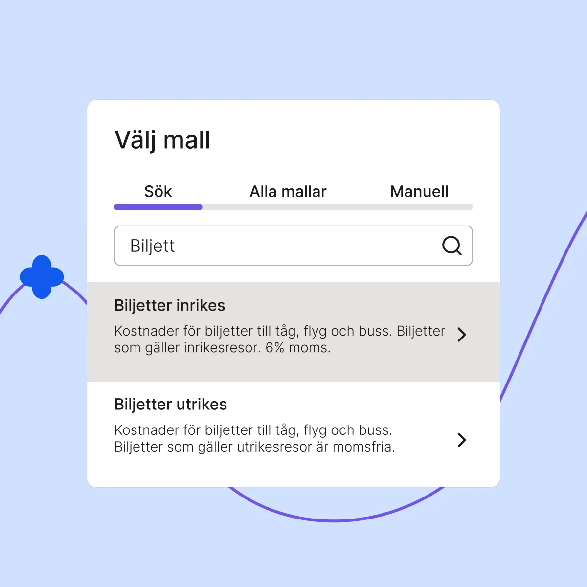 Synka dina transaktioner och få automatiska bokföringsförslag eller sök själv bland våra färdiga mallar. Det mesta kan du bokföra med bara ett eller två klick!
